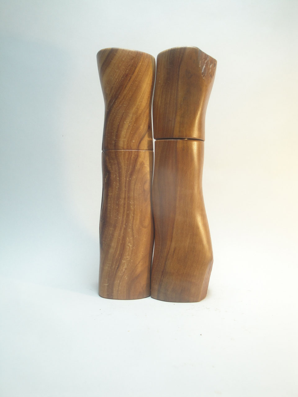 Ein eindrucksvolles Pfeffermühlen, Salzmühlen Set aus dem schönen Holz eines alten Birnbaumes mit dem Stahl und titanbeschichtetem Schweizer Mahlwerken und handgeschmiedeter Kurbel. Die Verdickung an der Unterseite kommt durch die Veredlungsstelle. Mit Naturkanten und alten Fraßgängen. Die Oberfläche ist dreifach mit Hartöle geölt. Höhe ohne Kurbel ca. 19,5 cm, mit Kurbel ca. 24 cm